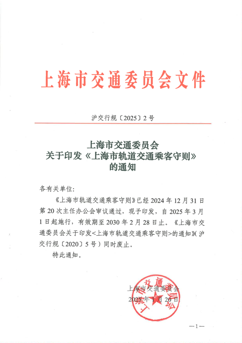 《上海市轨道交通乘客守则》已经2024年12月31日第20次主任办公会审议通过,现予印发,自2025年3月1日起施行,有效期至2030年2月28日止。《上海市交通委员会关于印发<上海市轨道交通乘客守则>的通知》(沪交行规〔2020〕5号)同时废止。