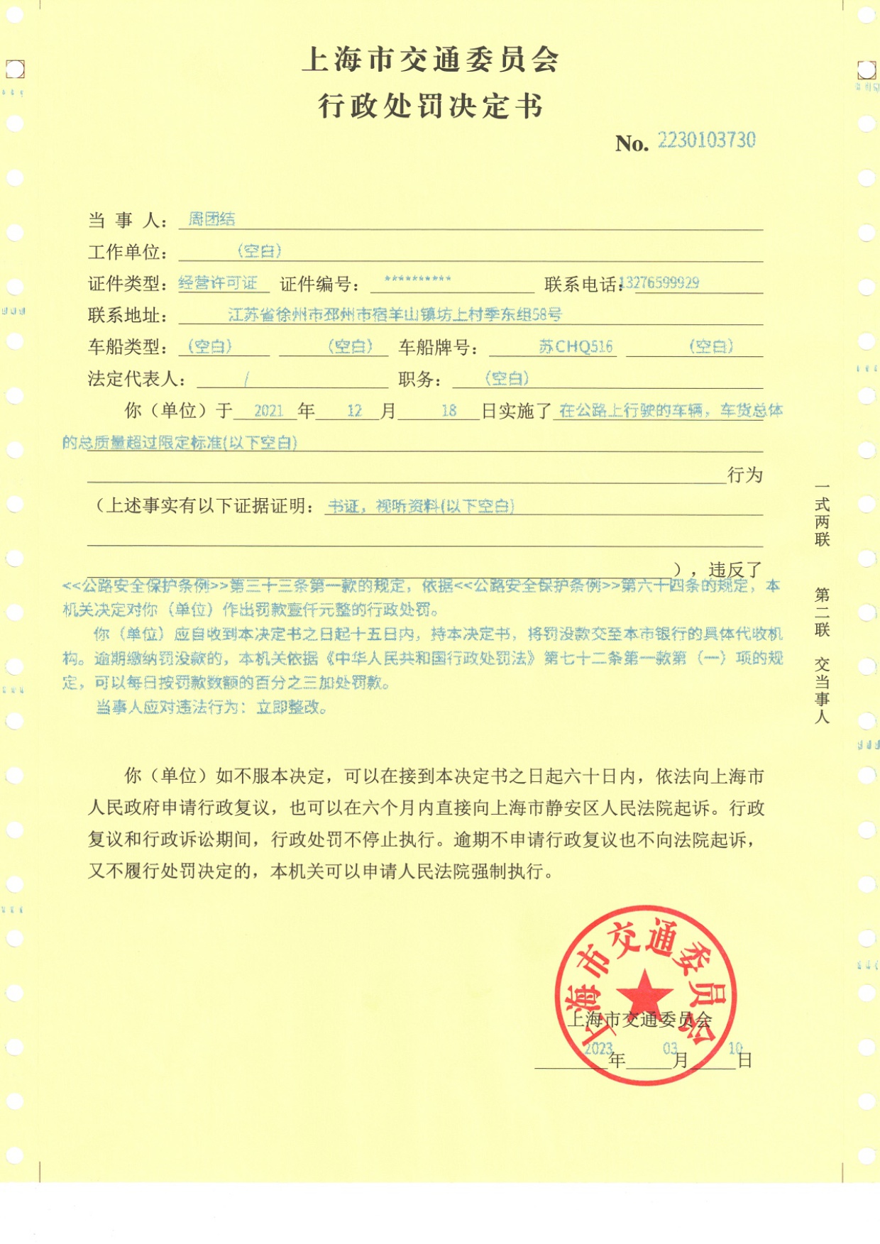 上海市交通委员会行政处罚决定书 | NO.2230103730 | 周团结 | 在公路上行驶的车辆,车货总体的总质量超过限定标准 | 罚款1000元整 |