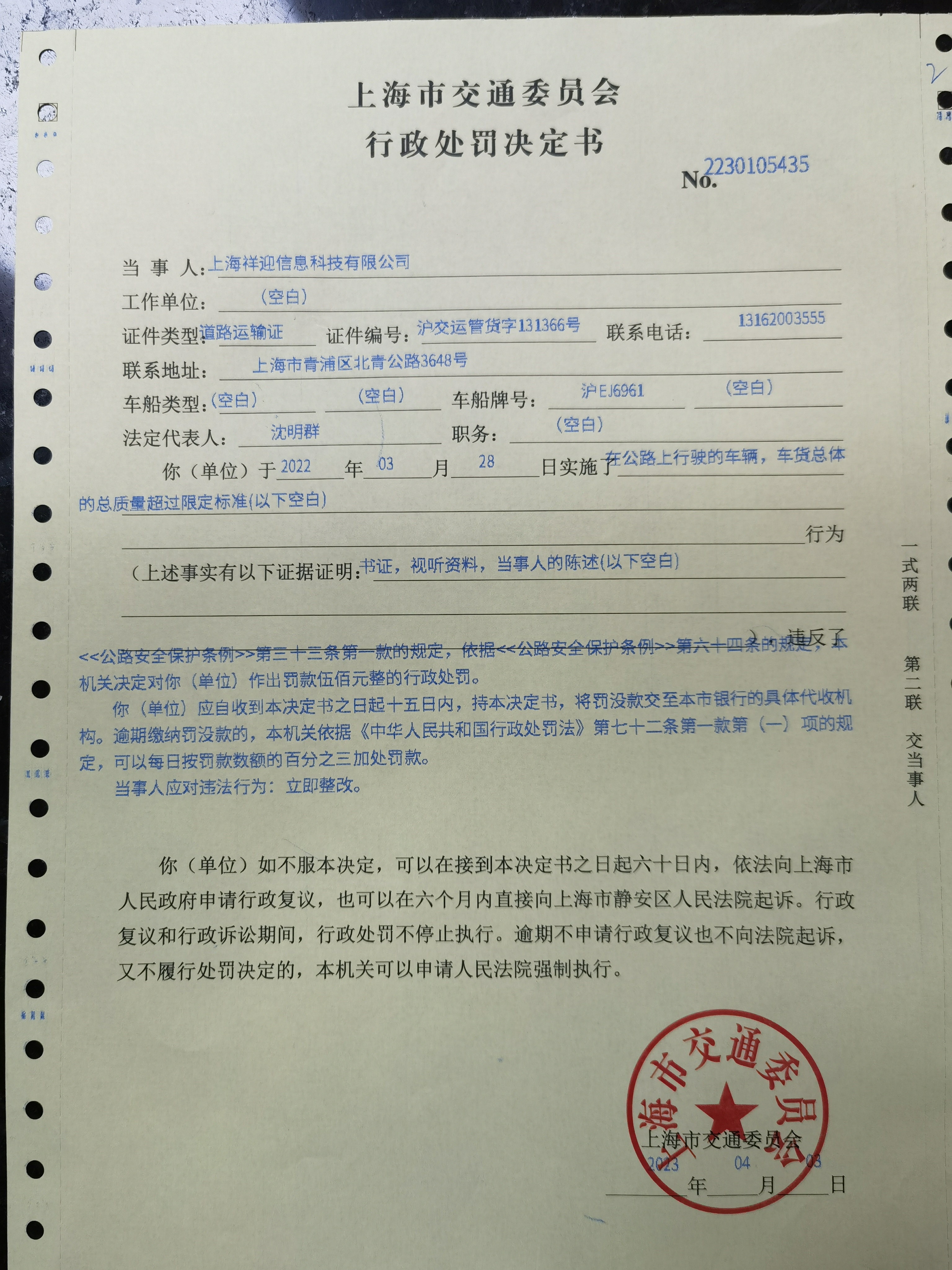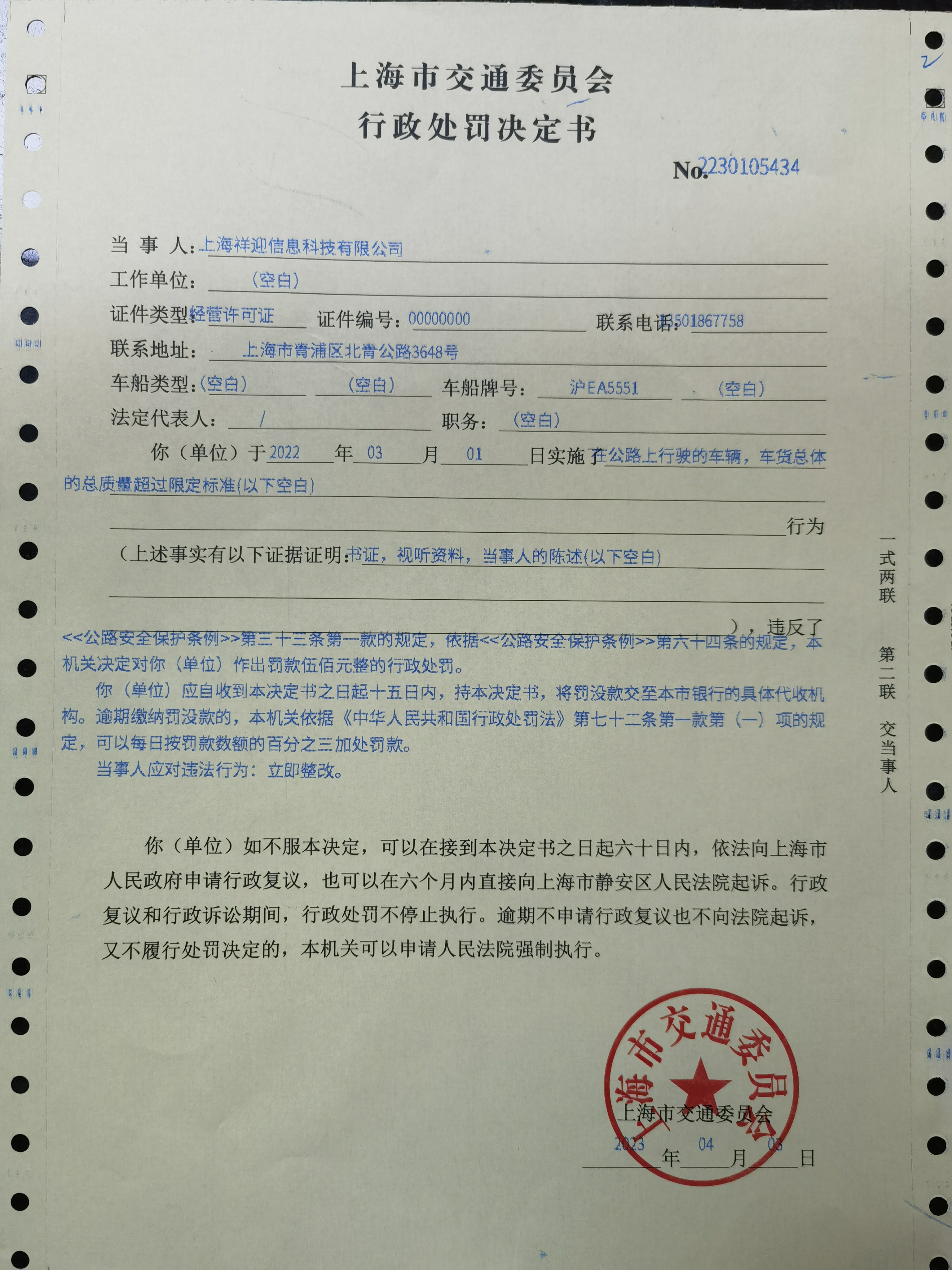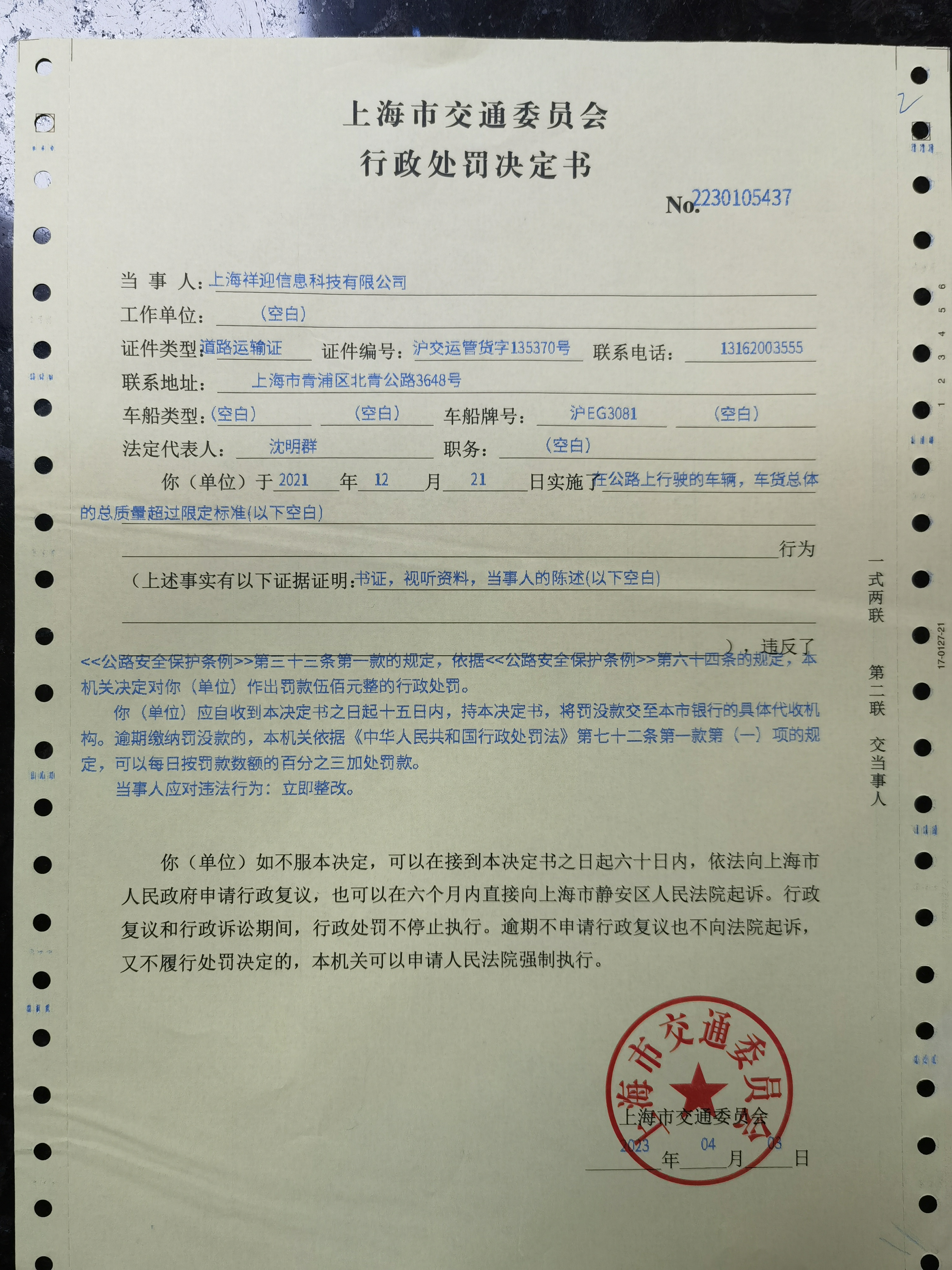 2 | 上海市交通委员会行政处罚决定书 | 2230105435 | 上海祥迎信息科技有限公司 | 上海市青浦区北青公路3648号 | 2023年04月08日 |