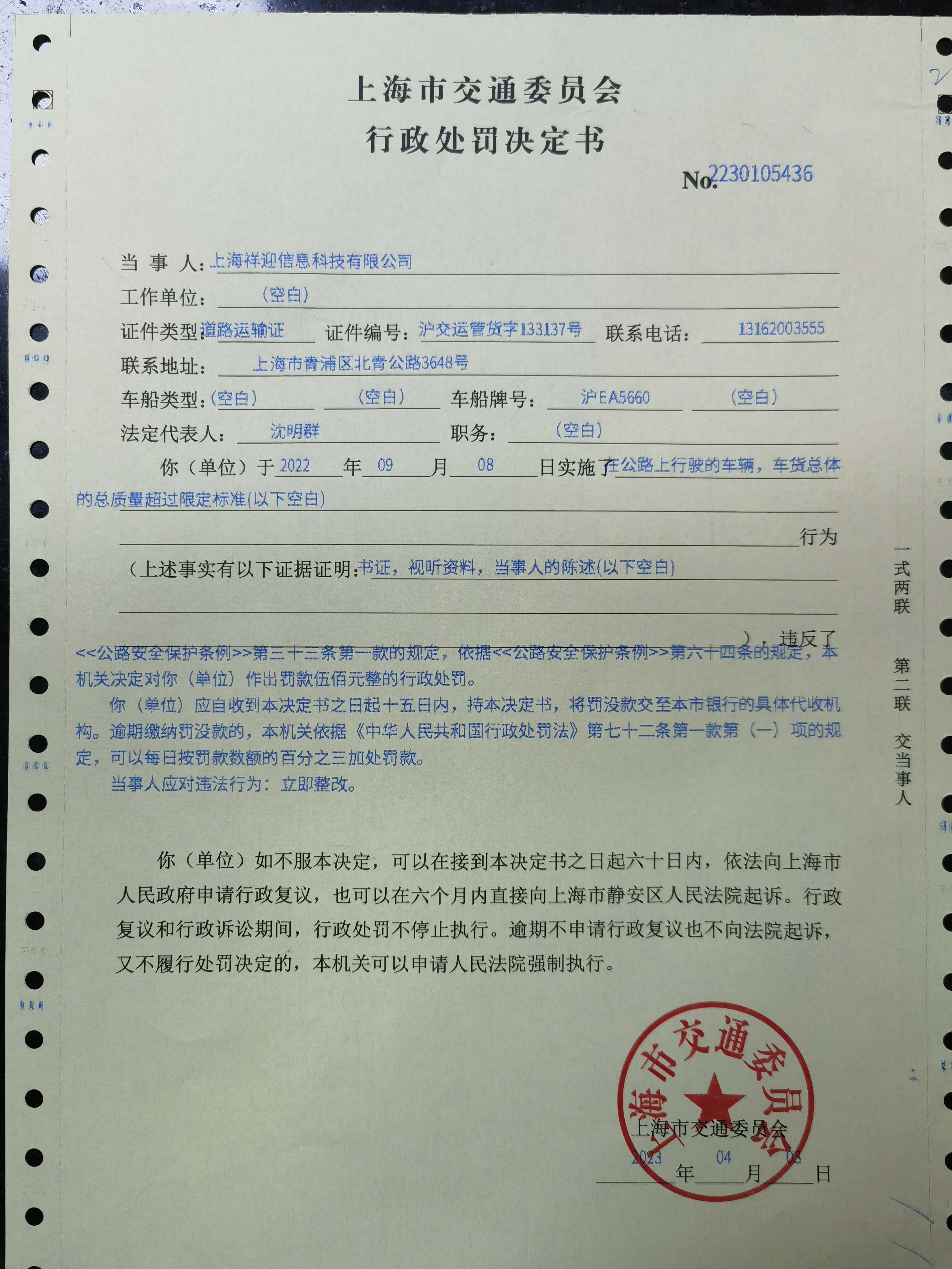 1 | 上海市交通委员会行政处罚决定书 | 2230105434 | 上海祥迎信息科技有限公司 | 上海市青浦区北青公路3648号 | 2023年04月08日 |
