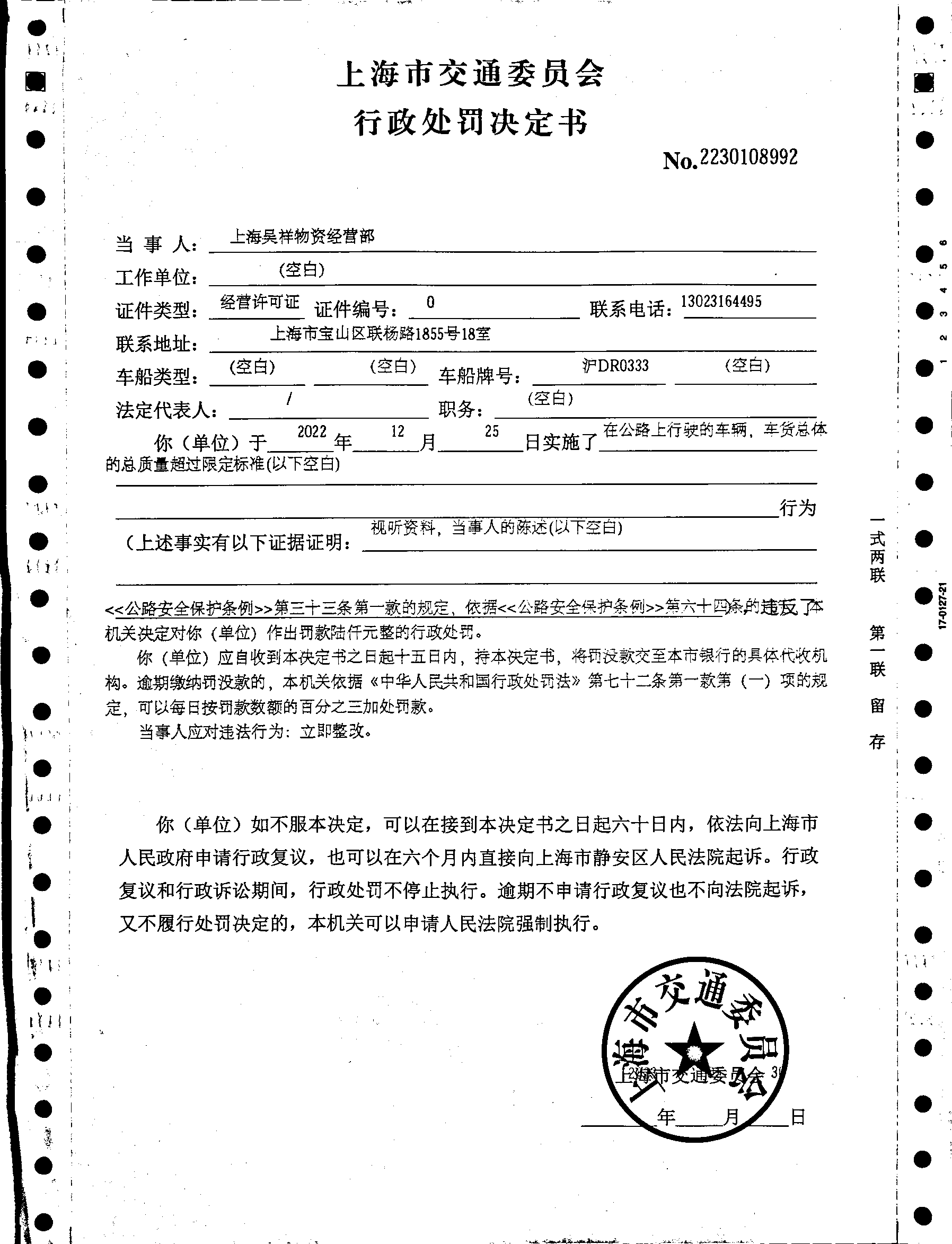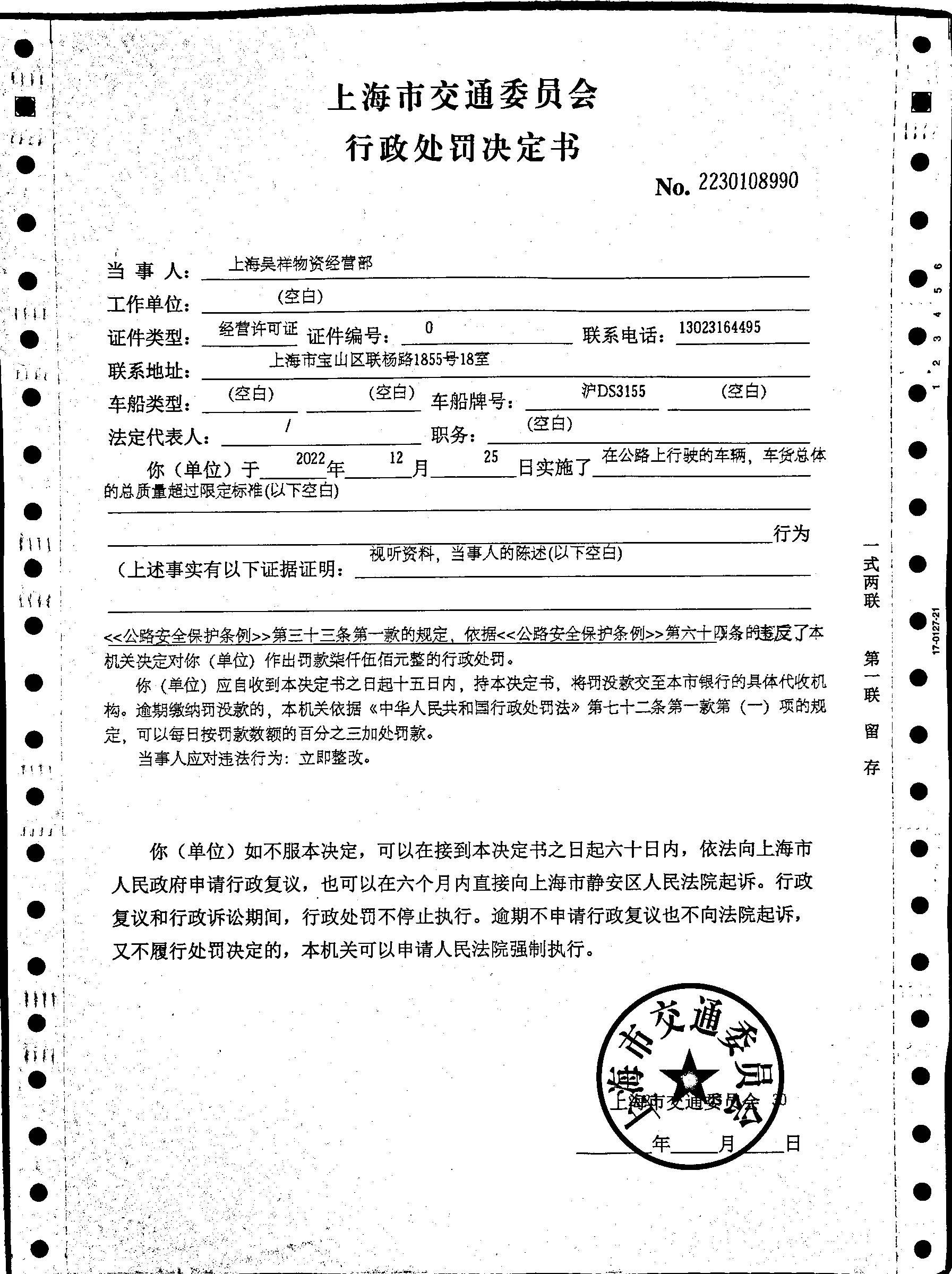 2 | 上海市交通委员会 行政处罚决定书 | 2230108992 | 上海吴祥物资经营部 | 上海市宝山区联杨路1855号18室 | 2023.06.05 |