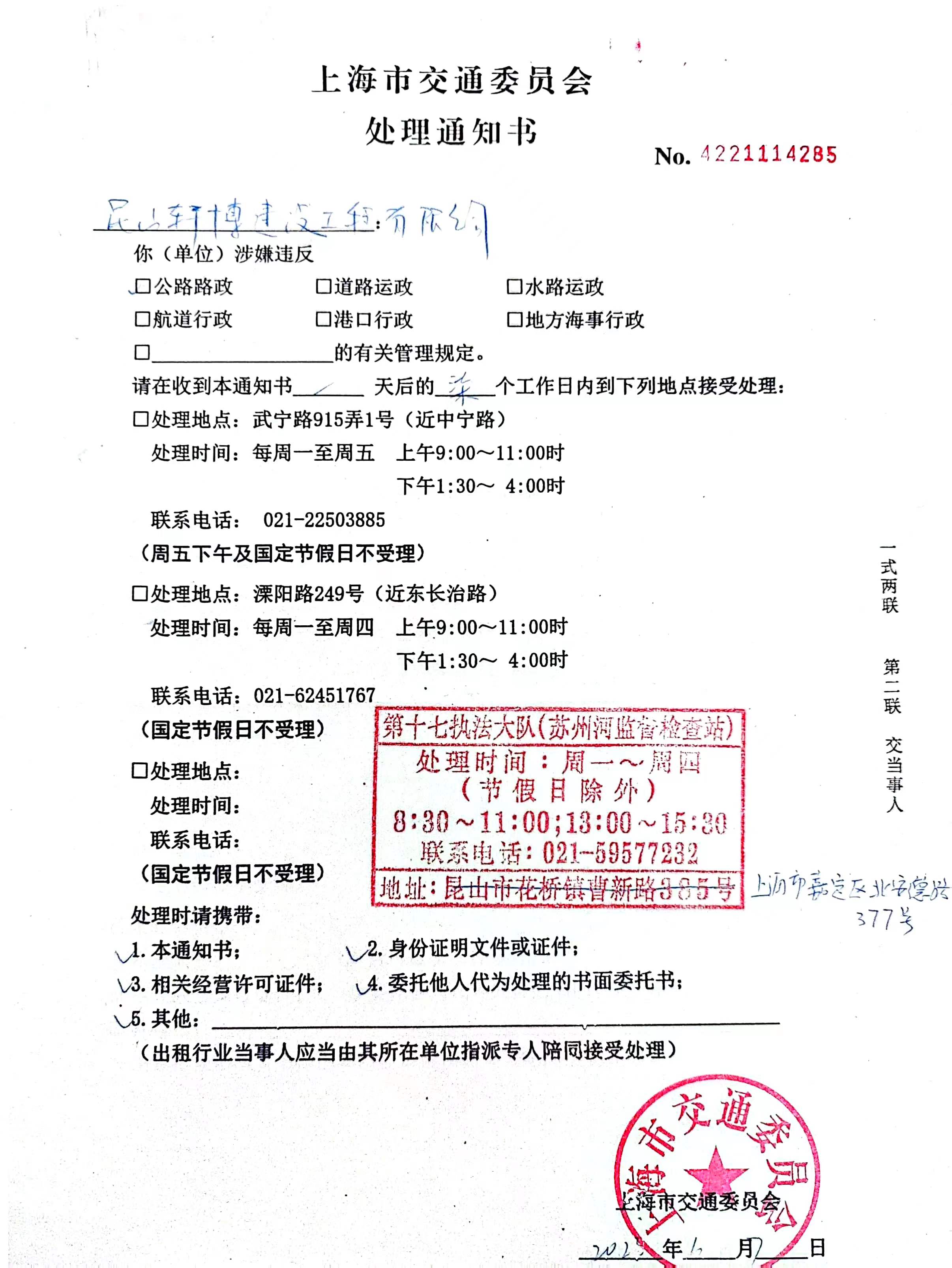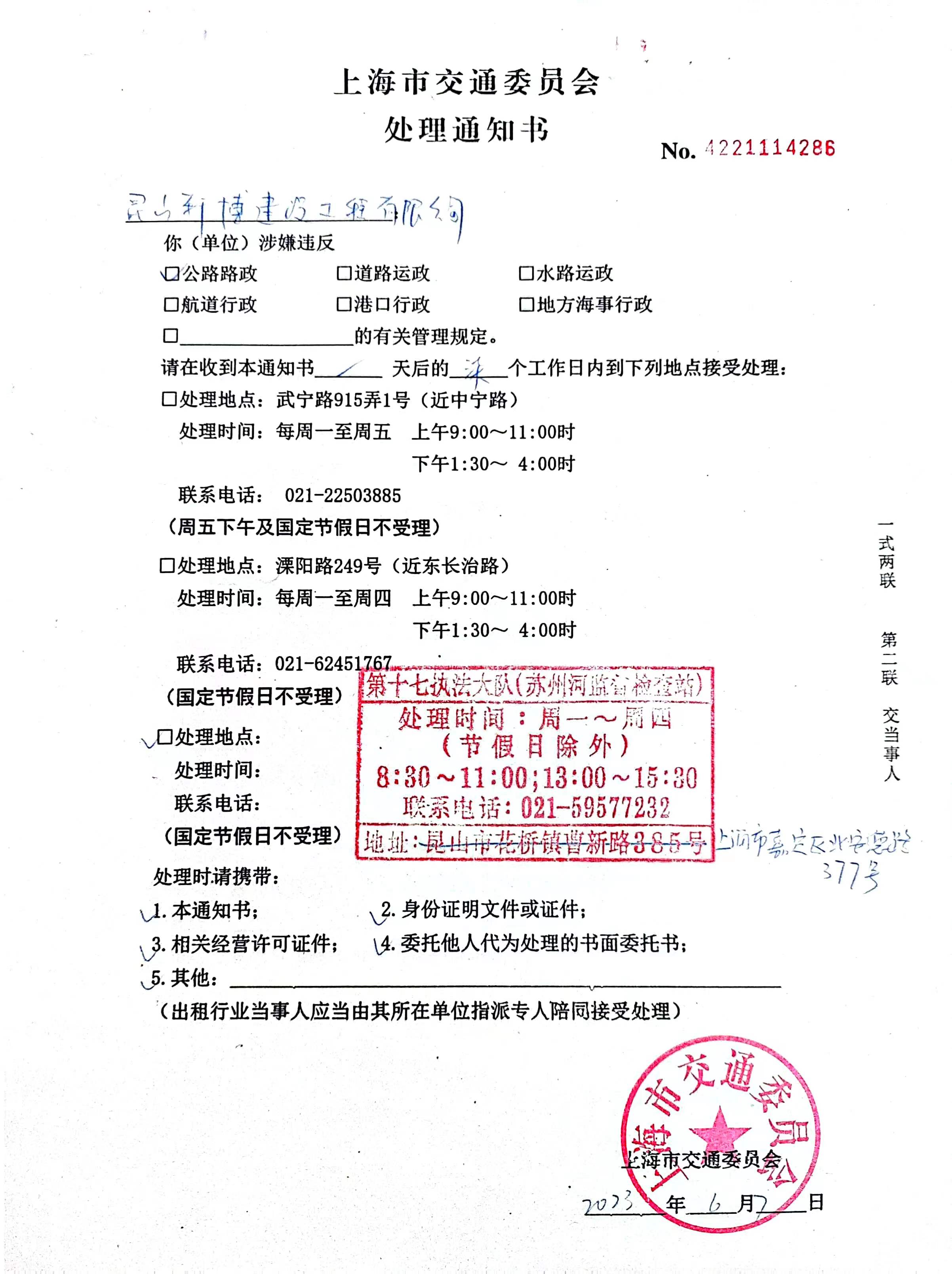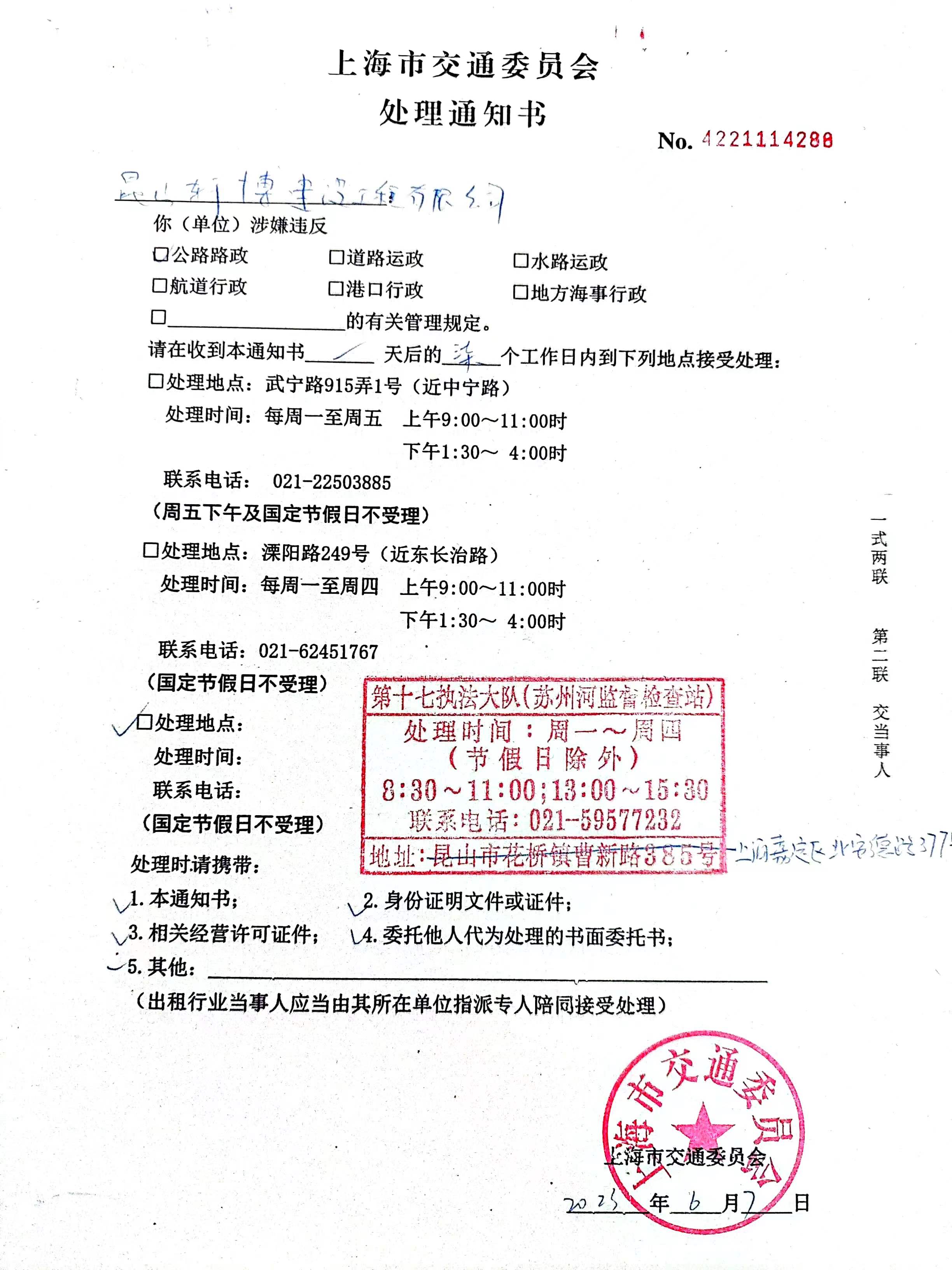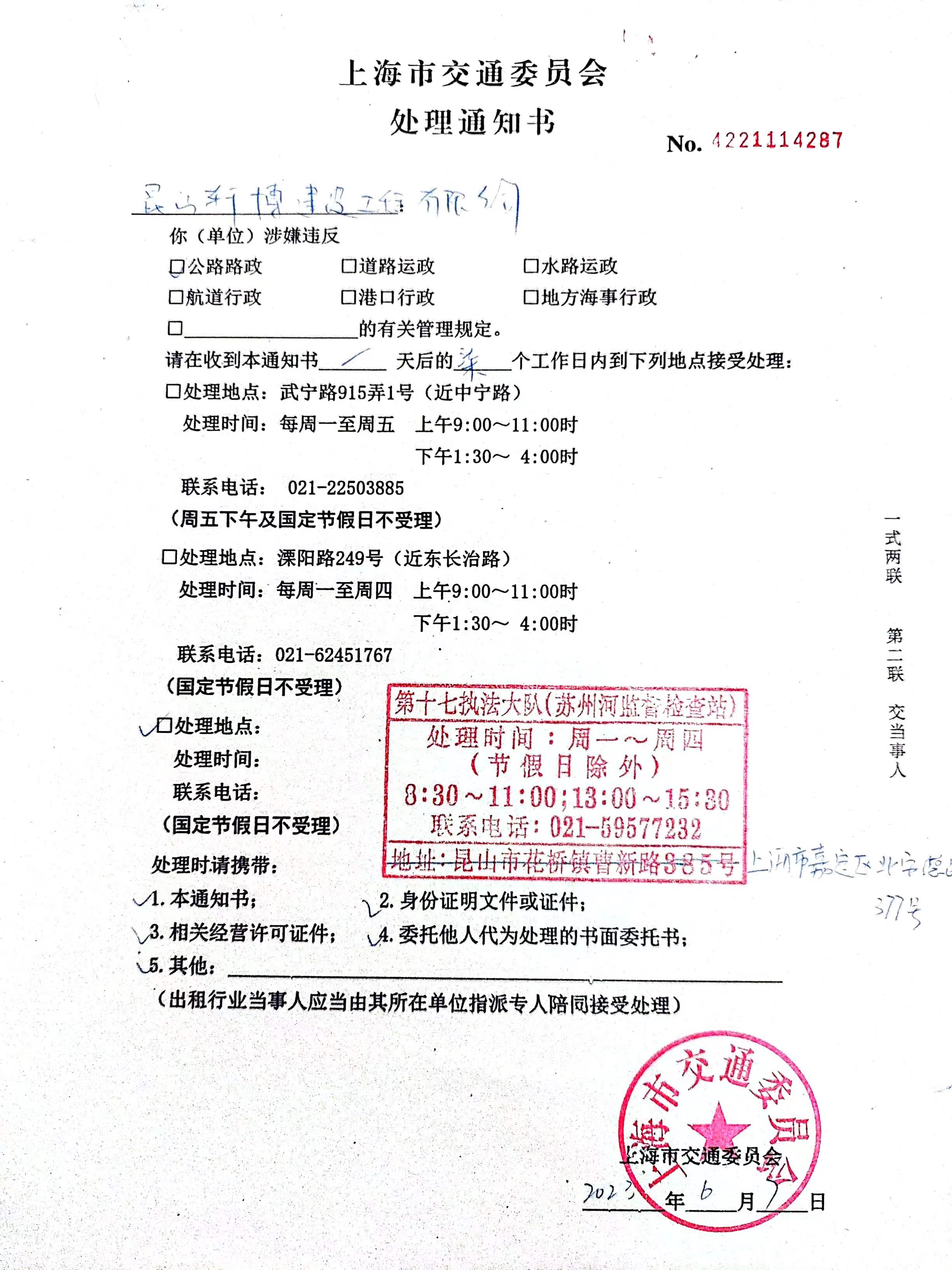 5 | 上海市交通委员会处理通知书 | 4221114287 | 昆山轩博建设工程有限公司 | 江苏省昆山市玉山镇同心花园2幢407室 | 2023.06.13 |