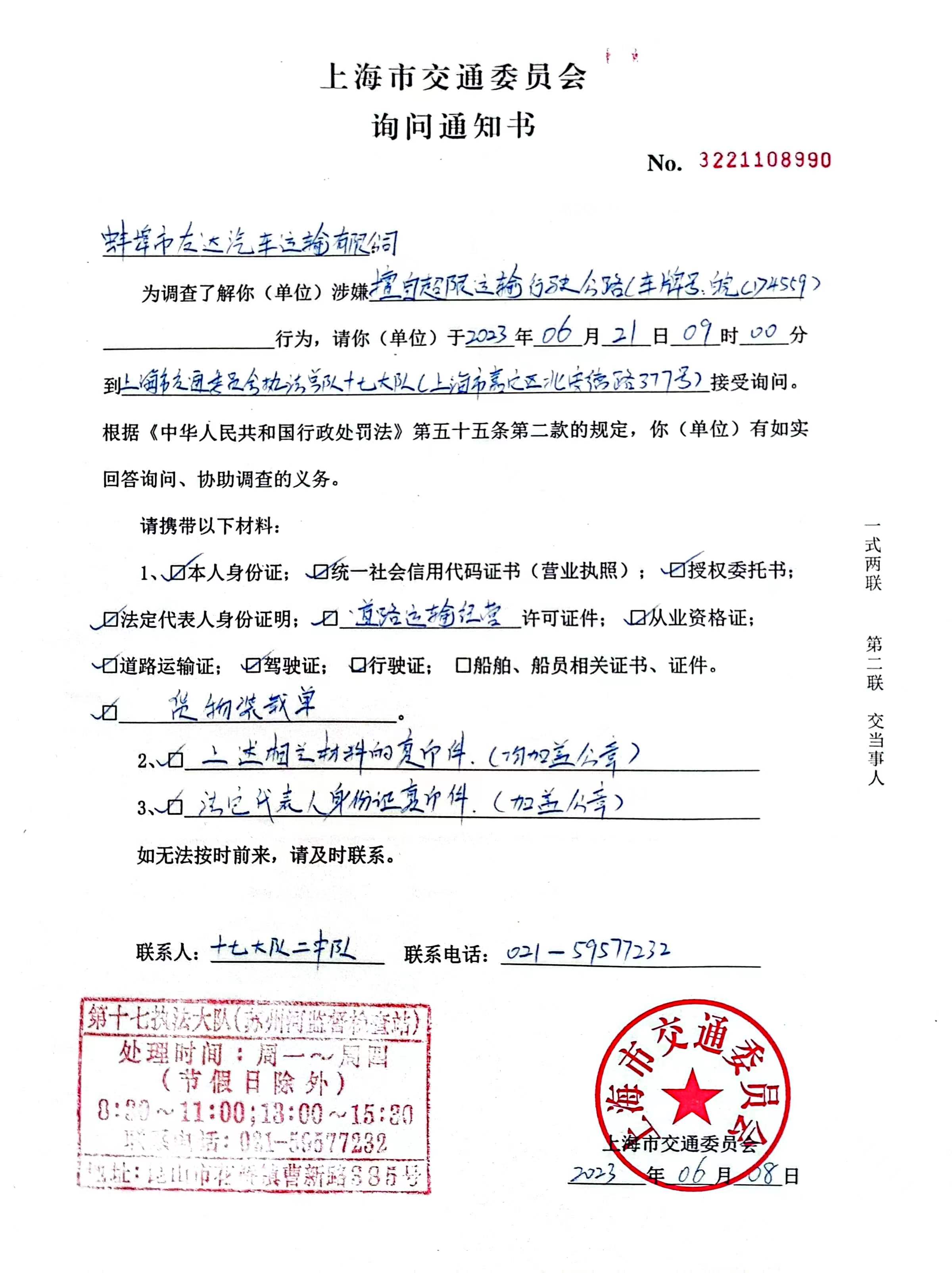 1 | 上海市交通委员会询问通知书 | 3221108990 | 蚌埠市友达汽车运输有限公司 | 上海市金山区金山卫镇西门街道1028号 | 2023.06.13 |