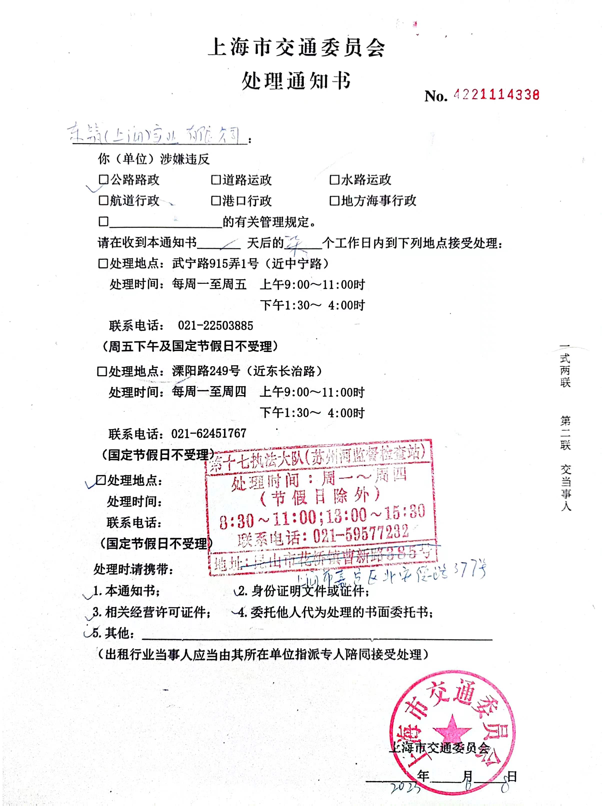 2 | 上海市交通委员会处理通知书 | 4221114338 | 东筑(上海)实业有限公司 | 上海市金山区金山卫镇学府路589号7幢2820号库 | 2023.06.13 |