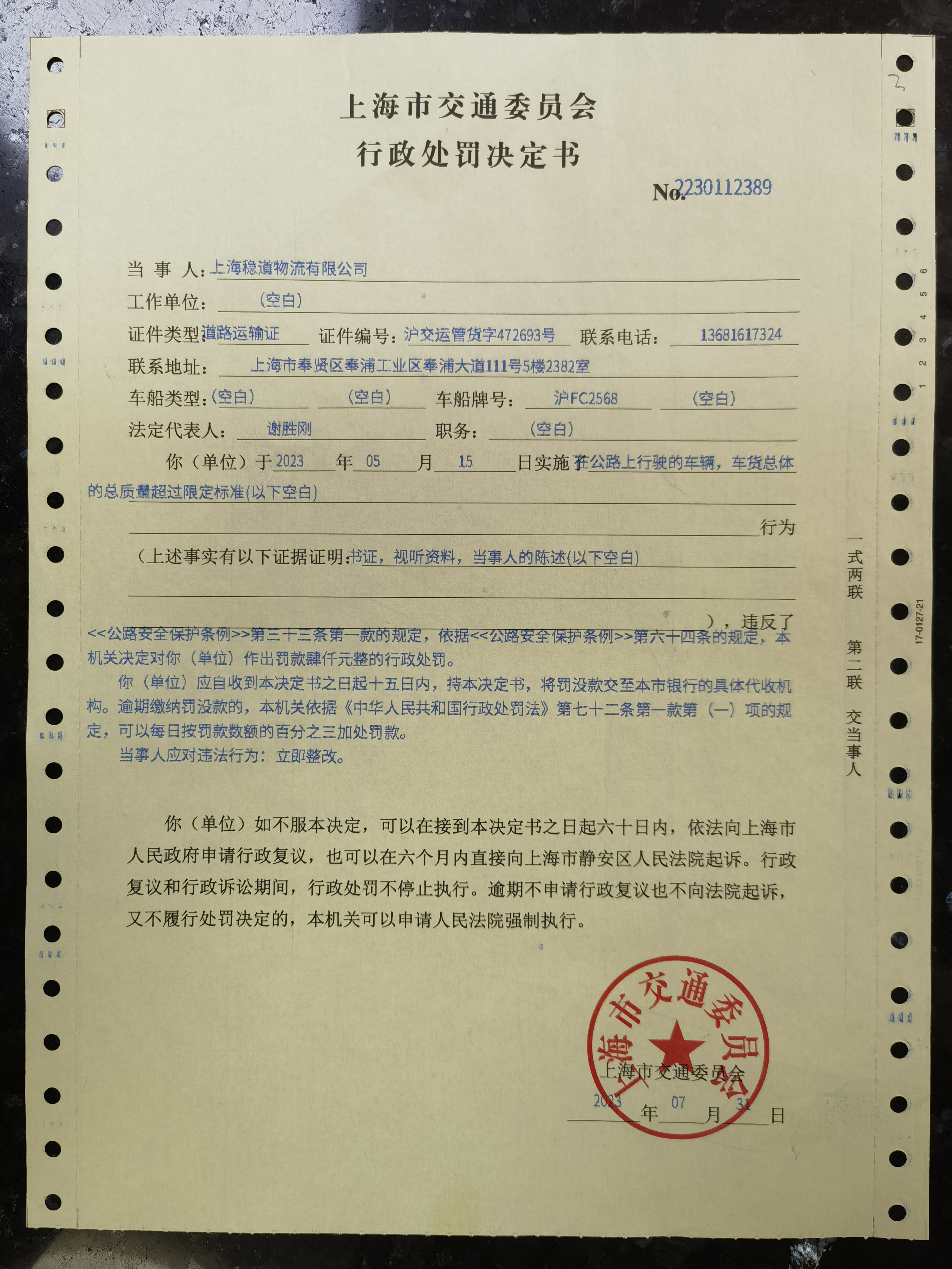 1 | 上海市交通委员会行政处罚决定书 | 2230112389 | 上海稳道物流有限公司 | 上海市奉贤区奉浦工业区奉浦大道111号5楼2382室 | 2023年08月06日 |