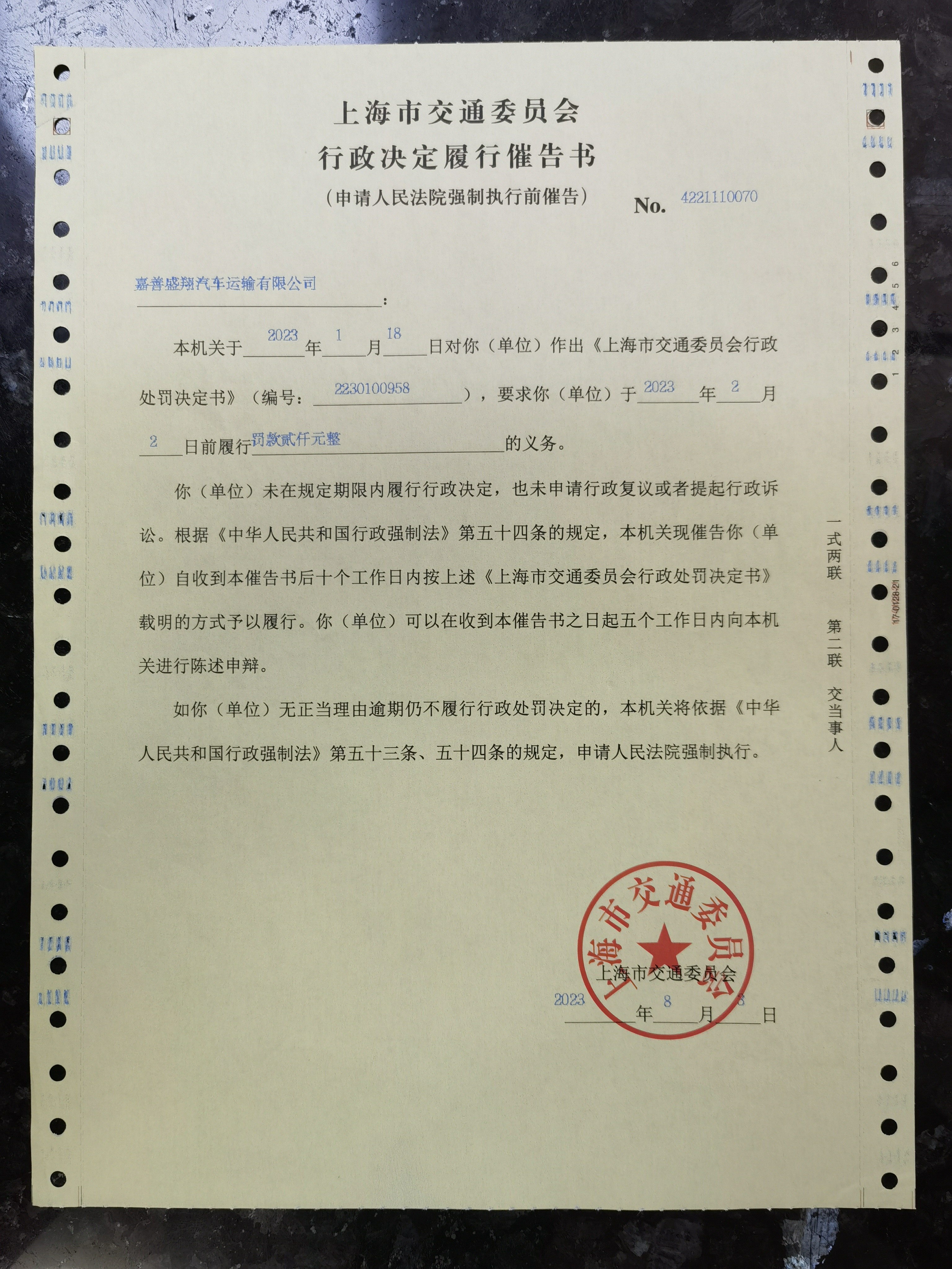 2 | 上海市交通委员会行政决定履行催告书 | 4221110070 | 嘉善盛翔汽车运输有限公司 | 浙江省嘉善县魏塘街道中寒圩村程家小区238号 | 2023年08月07日 |