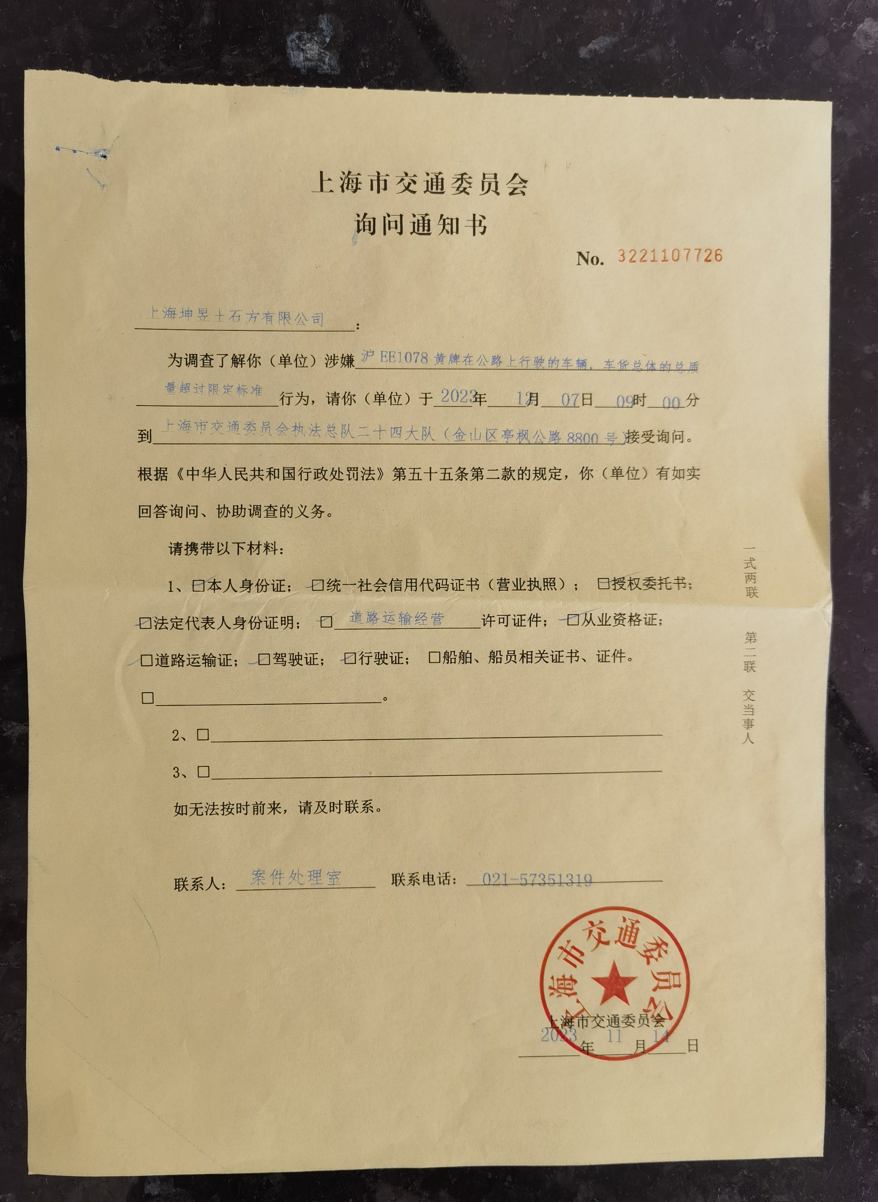 2 | 上海市交通委员会询问通知书 | 3221107726 | 上海坤昱土石方有限公司 | 上海市松江区石湖荡镇石湖新路95号 | 2023年11月22日 |