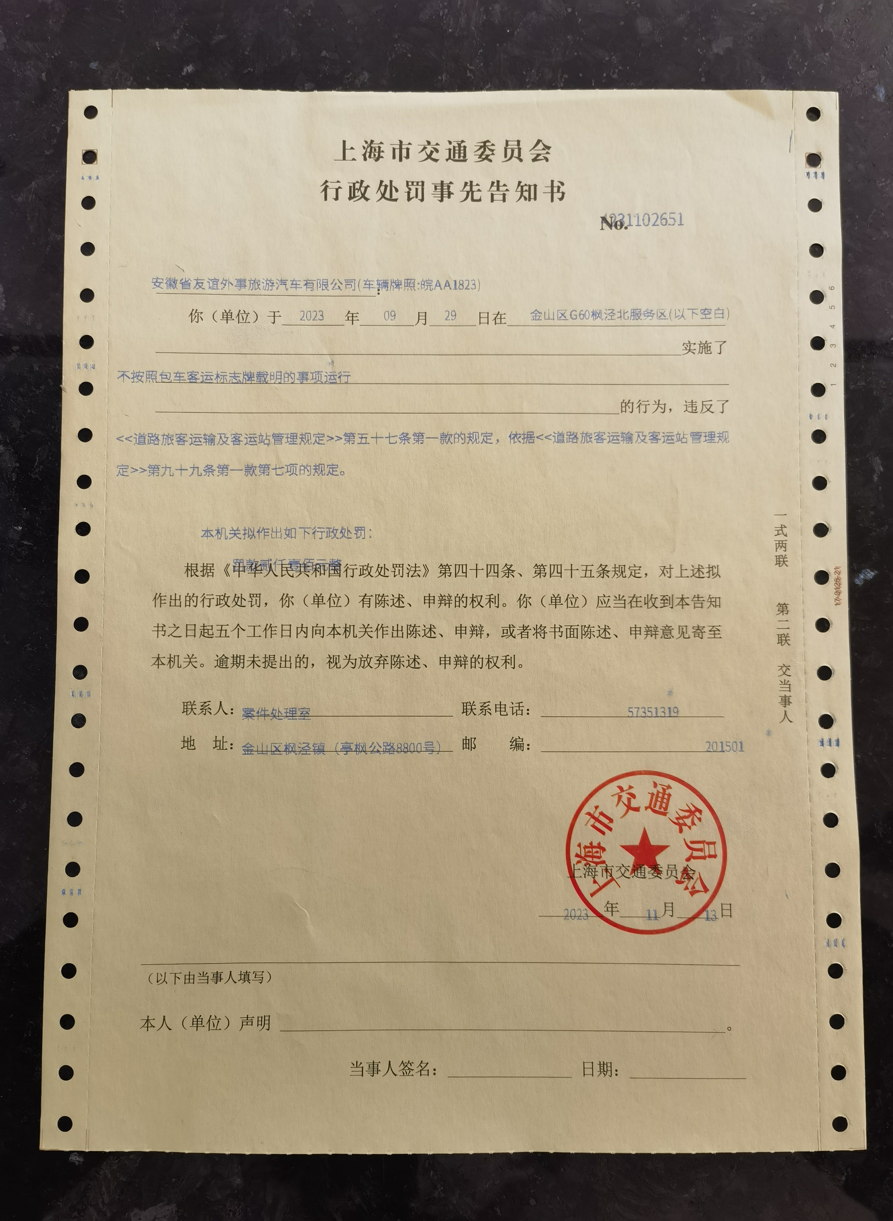 1 | 上海市交通委员会行政处罚事先告知书 | 4231102651 | 安徽省友谊外事旅游汽车有限公司 | 安徽省合肥市美菱大道115号 | 2023年11月21日 |