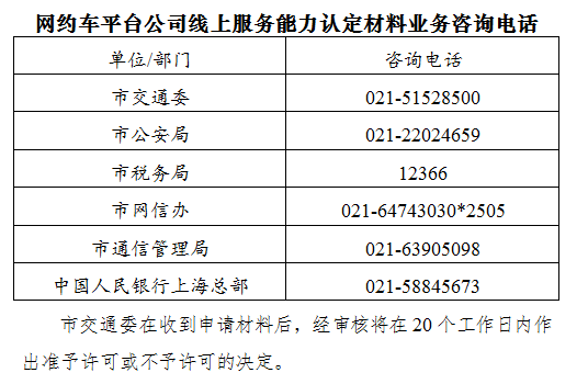 备注:相关许可条件、申请材料和其他办理方式查询可登陆上海交通网(www.jt.sh.cn)查阅《网络预约出租汽车经营者经营资质办事指南》。