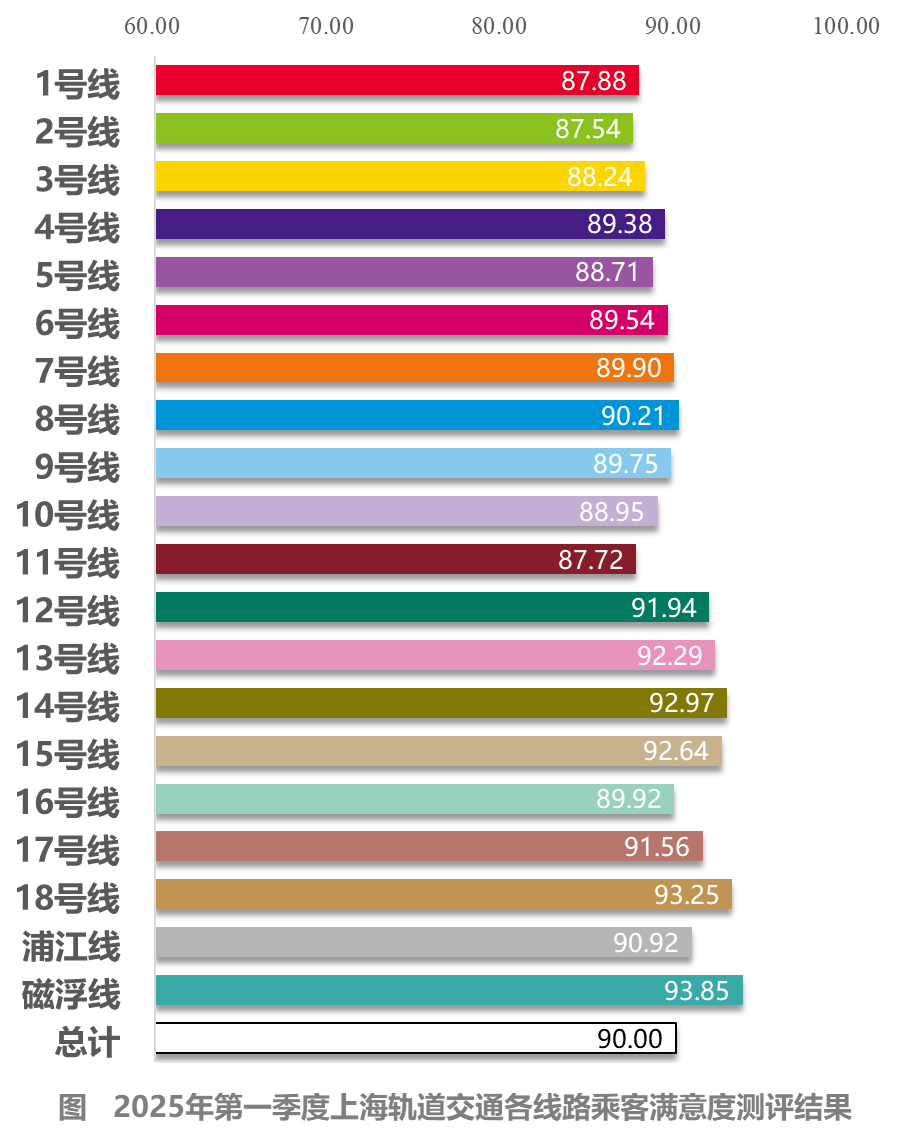2025年第一季度,上海市轨道交通运营服务乘客总体满意度为90.00,处于满意与较满意之间。与上季度相比,乘客满意度提升了0.25。