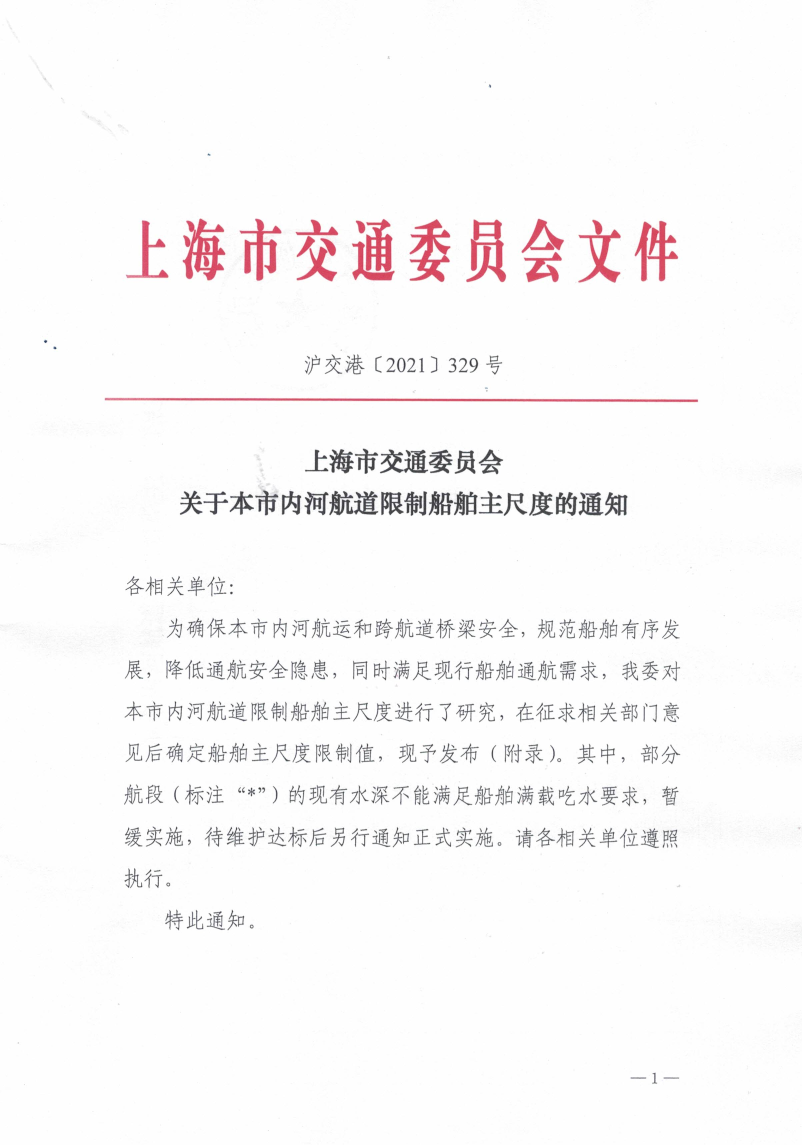为确保本市内河航运和跨航道桥梁安全,规范船舶有序发展降低通航安全隐患,同时满足现行船舶通航需求,我委对本市内河航道限制船舶主尺度进行了研究,在征求相关部门意见后确定船舶主尺度限制值,现予发布(附录)。其中:部分航段(标注“*”)的现有水深不能满足船舶满载吃水要求,暂缓实施,待维护达标后另行通知正式实施。请各相关单位遵照执行。
