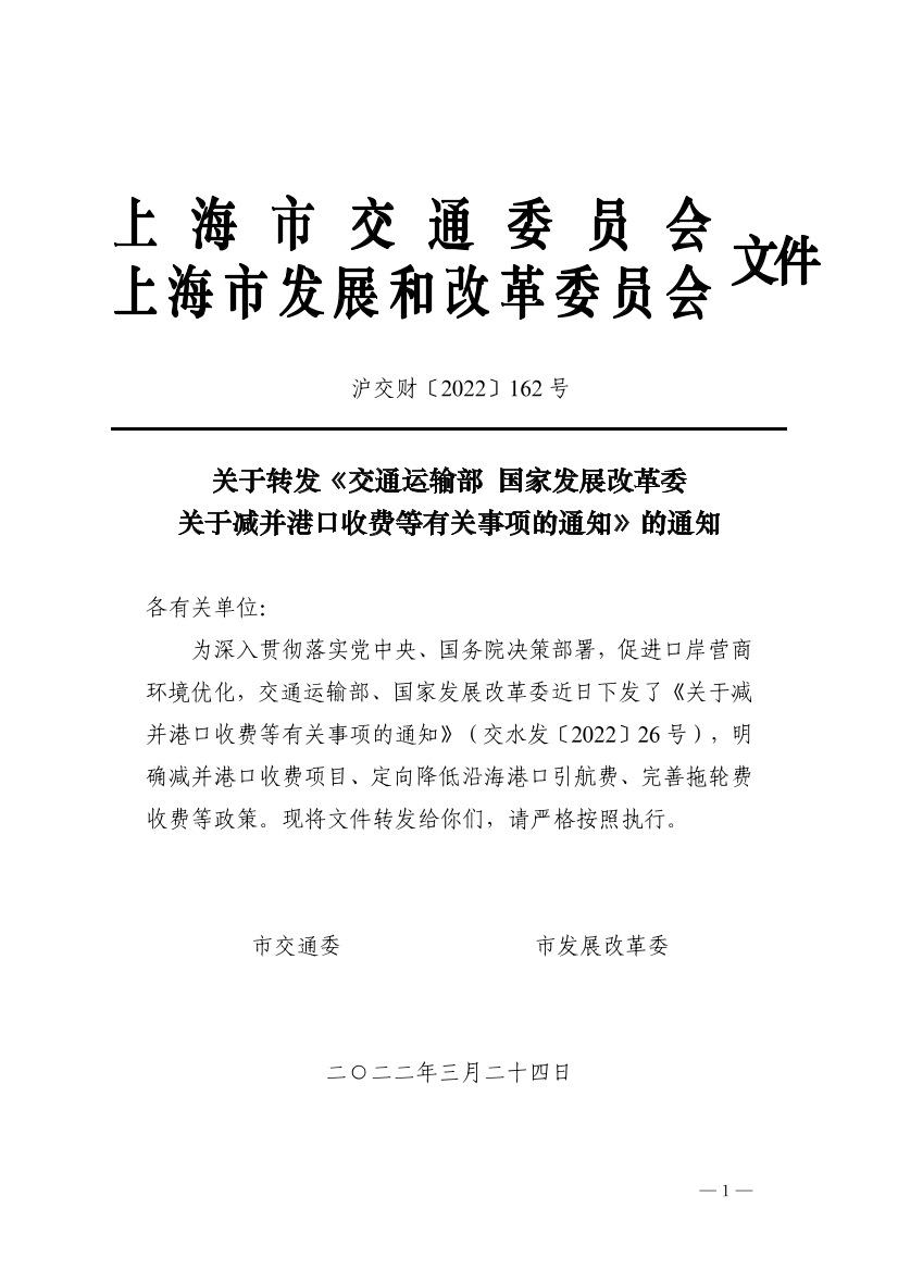 为深入贯彻落实党中央、国务院决策部署,促进口岸营商环境优化,交通运输部、国家发展改革委近日下发了《关于减并港口收费等有关事项的通知》(交水发〔2022〕26号),明确减并港口收费项目、定向降低沿海港口引航费、完善拖轮费收费等政策。现将文件转发给你们,请严格按照执行。