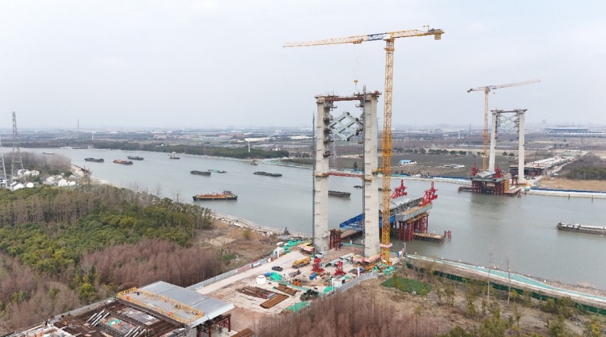 图:嘉松公路越江新建工程主塔窗花核心段吊装完成