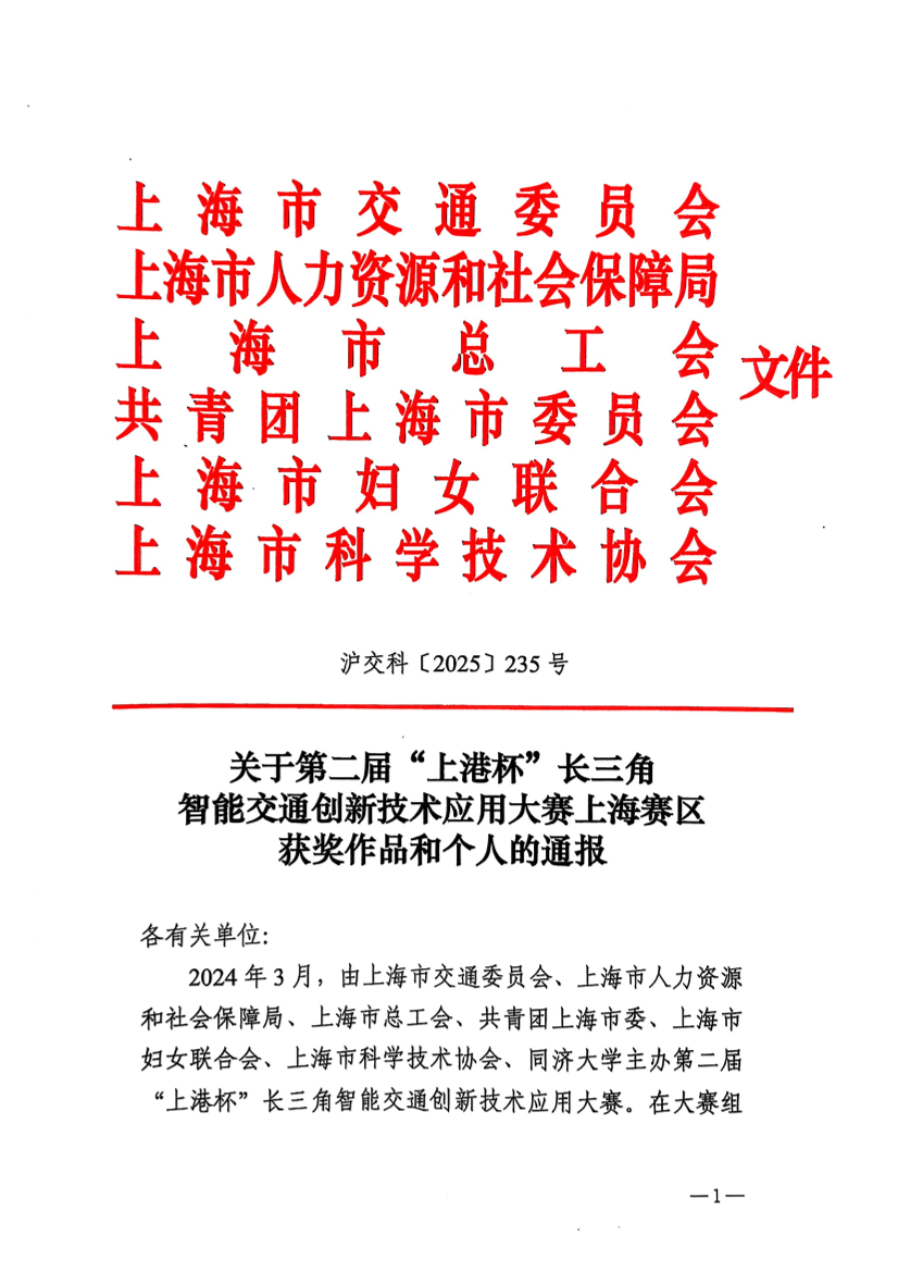 2024年3月,由上海市交通委员会、上海市人力资源和社会保障局、上海市总工会、共青团上海市委、上海市妇女联合会、上海市科学技术协会、同济大学主办第二届“上港杯”长三角智能交通创新技术应用大赛。在大赛组委会的领导下,在沪苏浙皖及高校五个赛区组委会的共同努力下,大赛自启动以来得到社会的广泛关注和积极参与,共有1177项作品报名,其中上海赛区151项。截至2024年10月,大赛评审委员会按照评审标准和程序圆满完成初赛、复赛和决赛评审工作。上海赛区设置赛区特等奖1项,一等奖1项,二等奖4项,三等奖5项,优秀奖6项。根据大赛奖励办法,现对上海赛区获奖作品和个人予以通报。