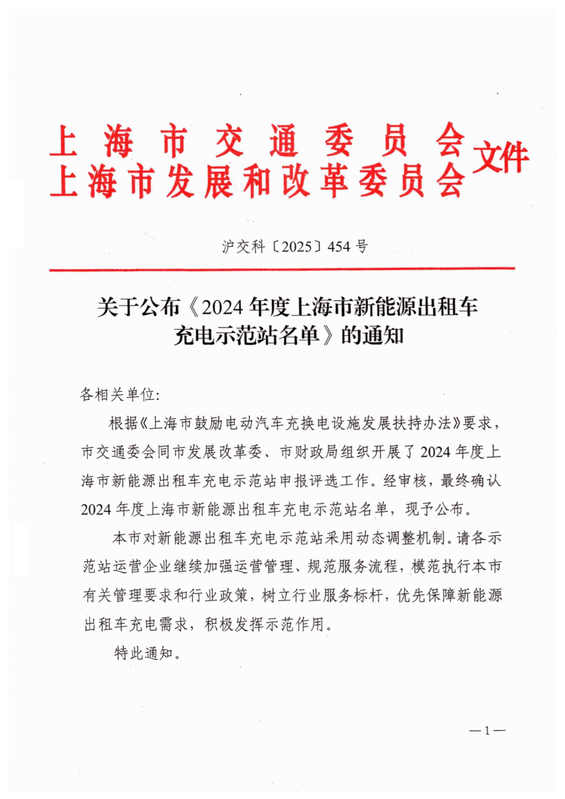 关于公布《2024年度上海市新能源出租车充电示范站名单》的通知